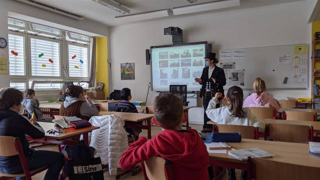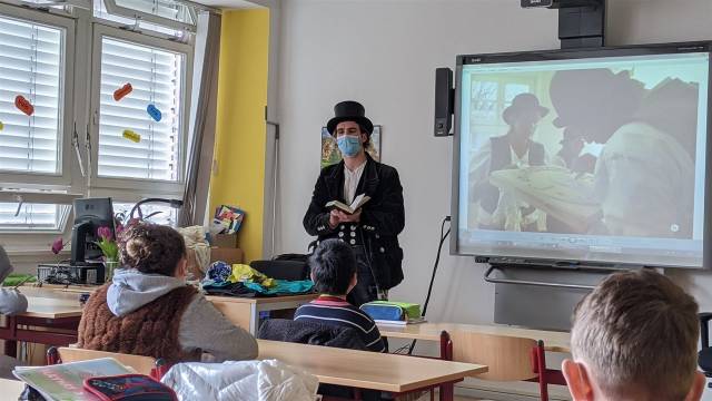 Kurzerhand hat unsere Schulleiterin einen ihrer Schwimmer, der diese Walz vor Kurzem selbst erlebt hatte, gefragt, ob er nicht den Kindern davon berichten mag. Mit sehr viel Freude stimmte er zu. In voller Zimmermannskleidung und samt Bündel, Wanderstock und Wanderbuch kam Georg Haack somit zu den Kindern und erzählte von der Tradition und seinen Erlebnissen dieser abenteuerlichen Reise. Er beantwortet die sehr interessanten Fragen der Kinder und auch Kollegen mit sehr viel Geduld und zeigte Bilder, um es alles zu verdeutlichen.