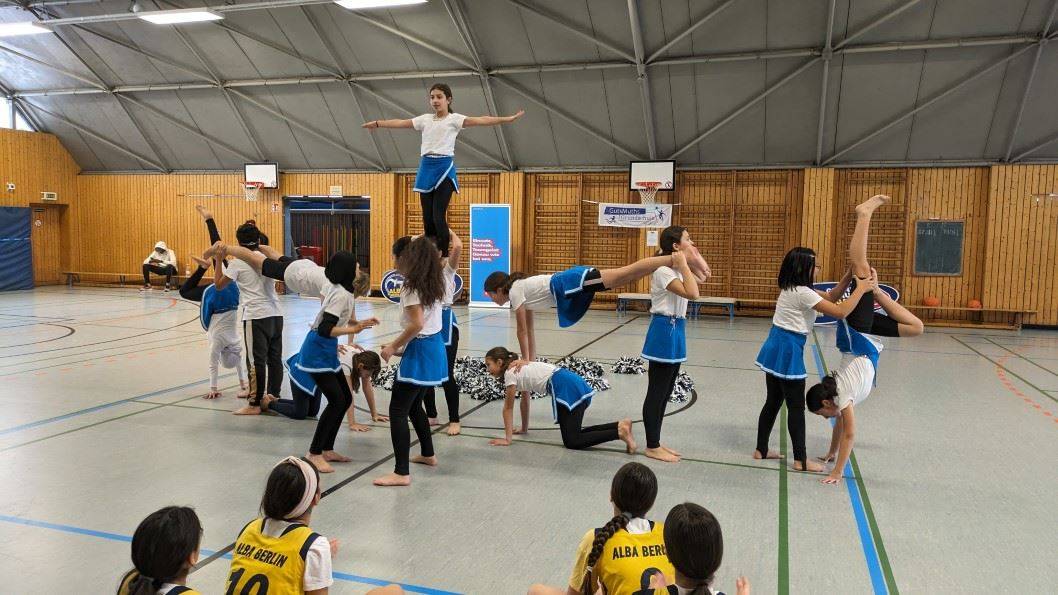 Eröffnet haben das Turnier, das wir bei uns in der Turnhalle durchgeführt haben, wie immer unsere Cheerleader. Wir nennen sie jetzt GutsMuths Dancer, da sie inzwischen ein gemischtes Team sind. Besonders schön war, dass einige von ihnen sich nach der Eröffnung das Basketballtrikot überwarfen und dann selbst das Turnier spielten. Die Hälfte unseres Mädchenteams ist nämlich auch beim Tanzen aktiv.