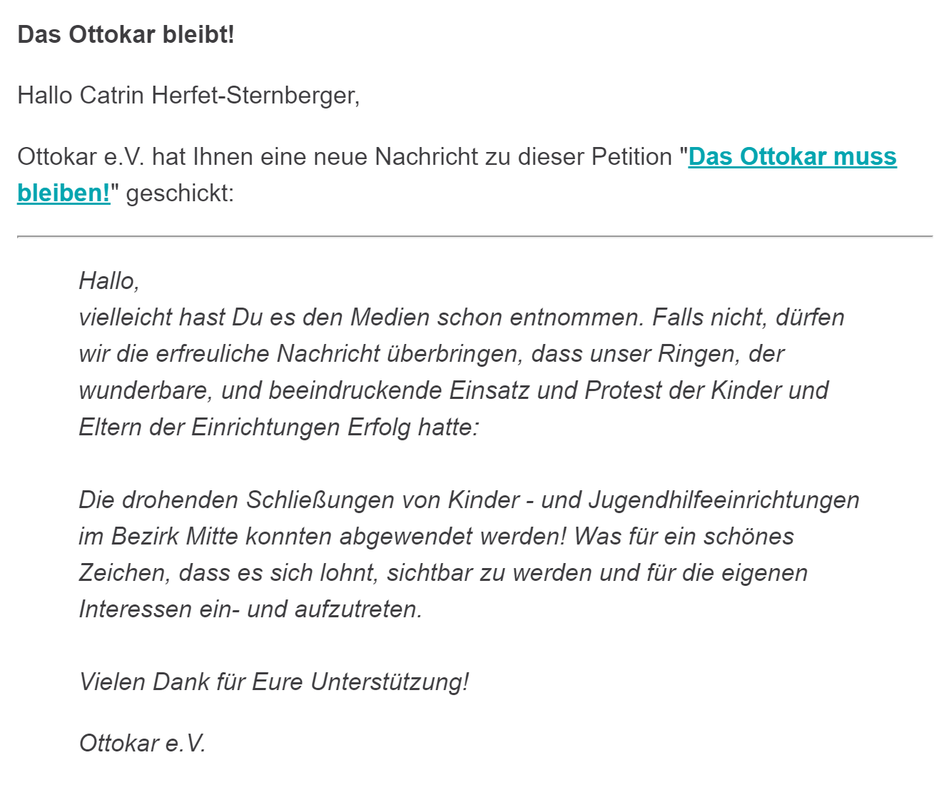 Die geplanten Schließungen aller Kinder- und Jugendfreizeiteinrichtungen in Berlin – Mitte ist ein falsches Signal und bedeutet für die Kinder und ihre Familien nichts Gutes. Wenn es keine Lösung für eine Weiterfinanzierung gibt, wird es spätestens ab Mitte Februar keine Möglichkeiten mehr geben, um unseren Schülerinnen und Schülern eurer Schule die Unterstützung durch den Kinderverein ermöglichen. Bitte unterstützt den Kampf um den Erhalt des Kinderzentrums. Schreibt an die politisch Verantwortlichen im Abgeordnetenhaus und in der BVV, sammelt Unterschriften. Einsparungen im Kinder- und Jugendbereich sind kein guter Weg, um die Kinder chancengerecht auf ihrem Entwicklungsweg zu begleiten.