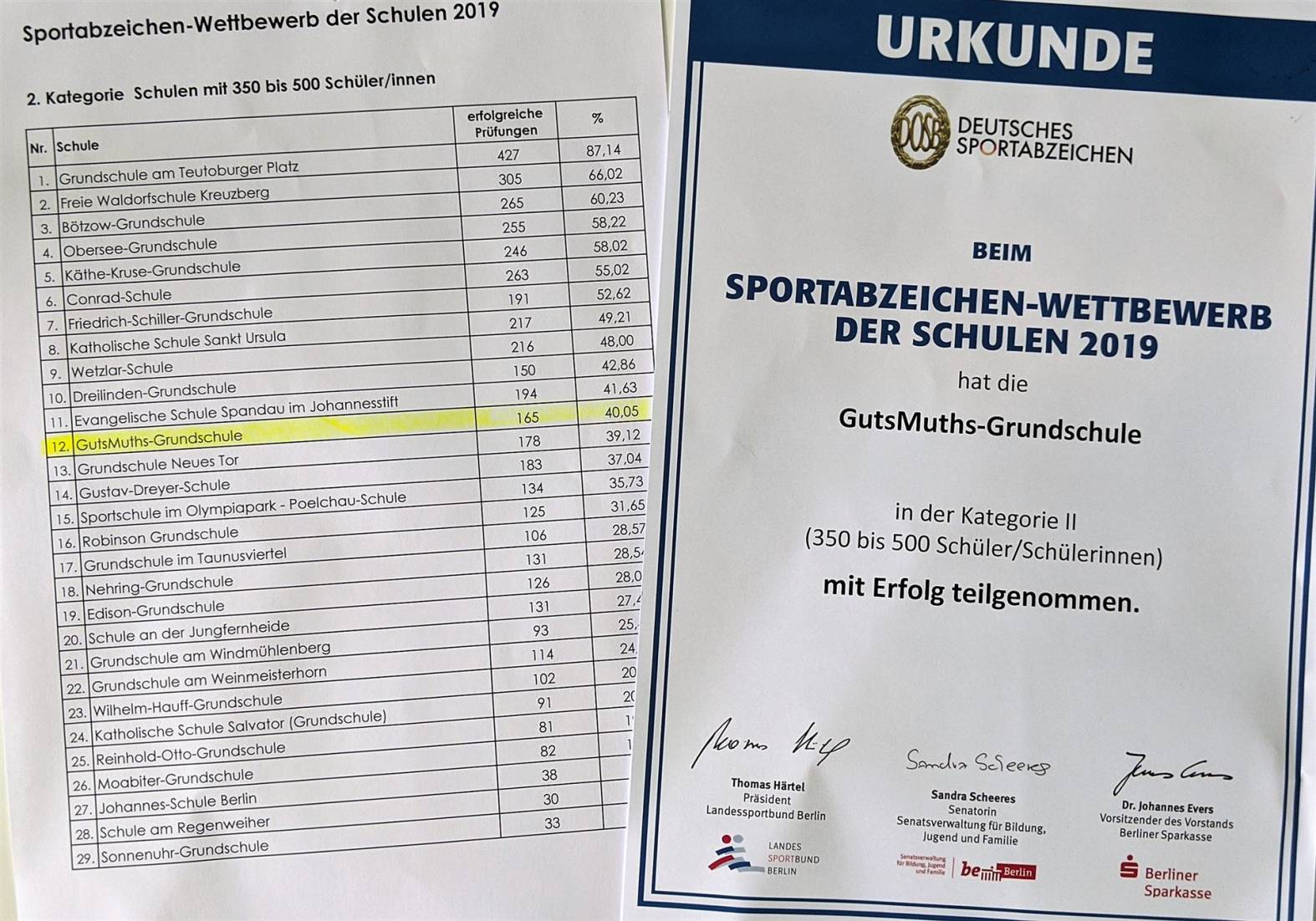 Jedes Jahr haben alle Kinder die Möglichkeit das Sportabzeichen bei uns abzulegen. Alle Werte und erreichten Leistungen reichen wir beim LSB ein. Der Sportabzeichenwettbewerb der Schule schaut dann, wer die meisten Abzeichen erreicht hat. Im vergangenen Jahr 2019 haben wir den 12. Platz erreicht! Eine so gute Platzierung im Gesamttableau hatten wir in den letzten 10 Jahren nicht! Wir freuen uns sehr - auch über die 250€ für den Förderverein! Danke an den LSB für die Möglichkeit!