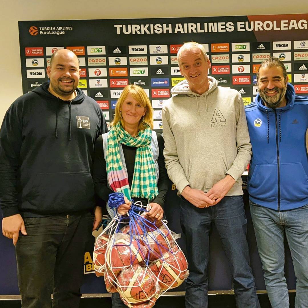 Im Presseraum der Mercedes-Benz-Arena wurden den ausgewählten Schulen nach einen kleinen Austausch von Henning Harnisch und Marius Huth die Bälle übergeben. Anschließend sahen wir dann gemeinsam mit den Kollegen der anderen Schulen das Euroleague-Topspiel gegen den FC Barcelona unserer Albatrosse. Für unsere Schulleiterin war es auch ein schönes Wiedersehen mit ihren Kollegen von Alba Berlin, mit denen sie vor 17 Jahren bei Alba ihre ersten Jugendteams gemeinsam trainierte.