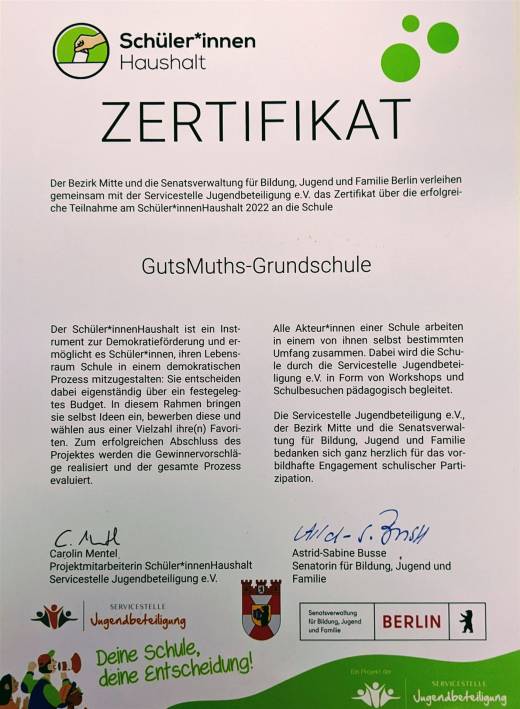 Unsere Klassensprechenden treffen sich wöchentlich im Schülerparlament, um gemeinsam die für alle wichtigen Dinge für eine freundliches und glückliches Miteinander an der Schule zu besprechen und weiter zu entwickeln. Der Schüler:innenhaushalt war in diesem Zuge eine tolle Möglichkeit, die Kinder auch mit einem eigenen Budget auszustatten. Gesagt getan. Das Planungsteam hat an Workshopsteil genommen und den Planungsprozess in Gang ge- und umgesetzt. Wir alle freuen uns nun über höhenverstellbare, rollende Stühle, Soundboxen, Knete, Lego und Bälle. Dafür haben heute die Kinder vom Planungsteam und wir als Schule bei einer Abschlussveranstaltung ein Zertifikat bekommen. Unterstützt und begleitet wird das Schülerparlament und der Schülerhaushalt von Frau Apenburg und unseren Schulsozialarbeiterinnen. Vielen Dank allen für eure Initiative für eine glückliche, gesunde Schule.