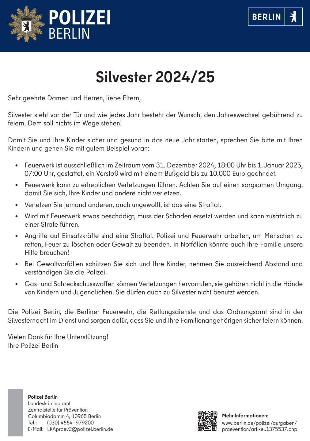 Elternbrief zum Jahreswechsel der Berliner Polizei