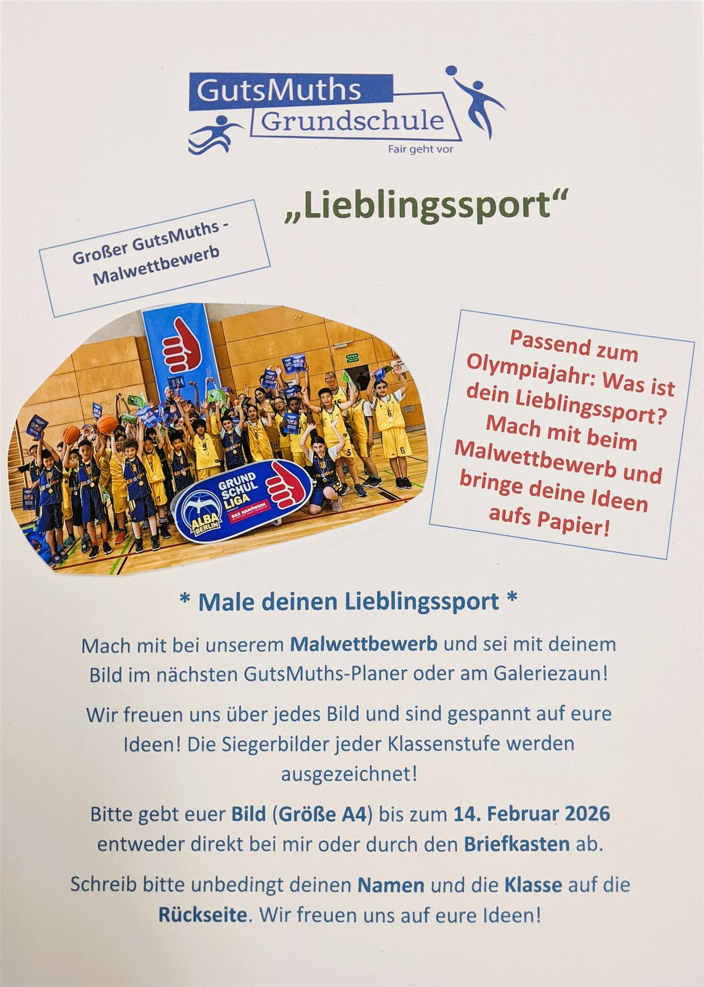 Die Handball-EM hat begonnen, Franz und Moritz Wagner sind mit ihren Orlando-Magic und dem NBA-Zirkus grade durch die Stadt gefegt, die Olympischen Winterspiele nahen und wir sind eine sportorientierte Grundschule - welches Thema könnte also passender sein, als "Lieblingssport"?
