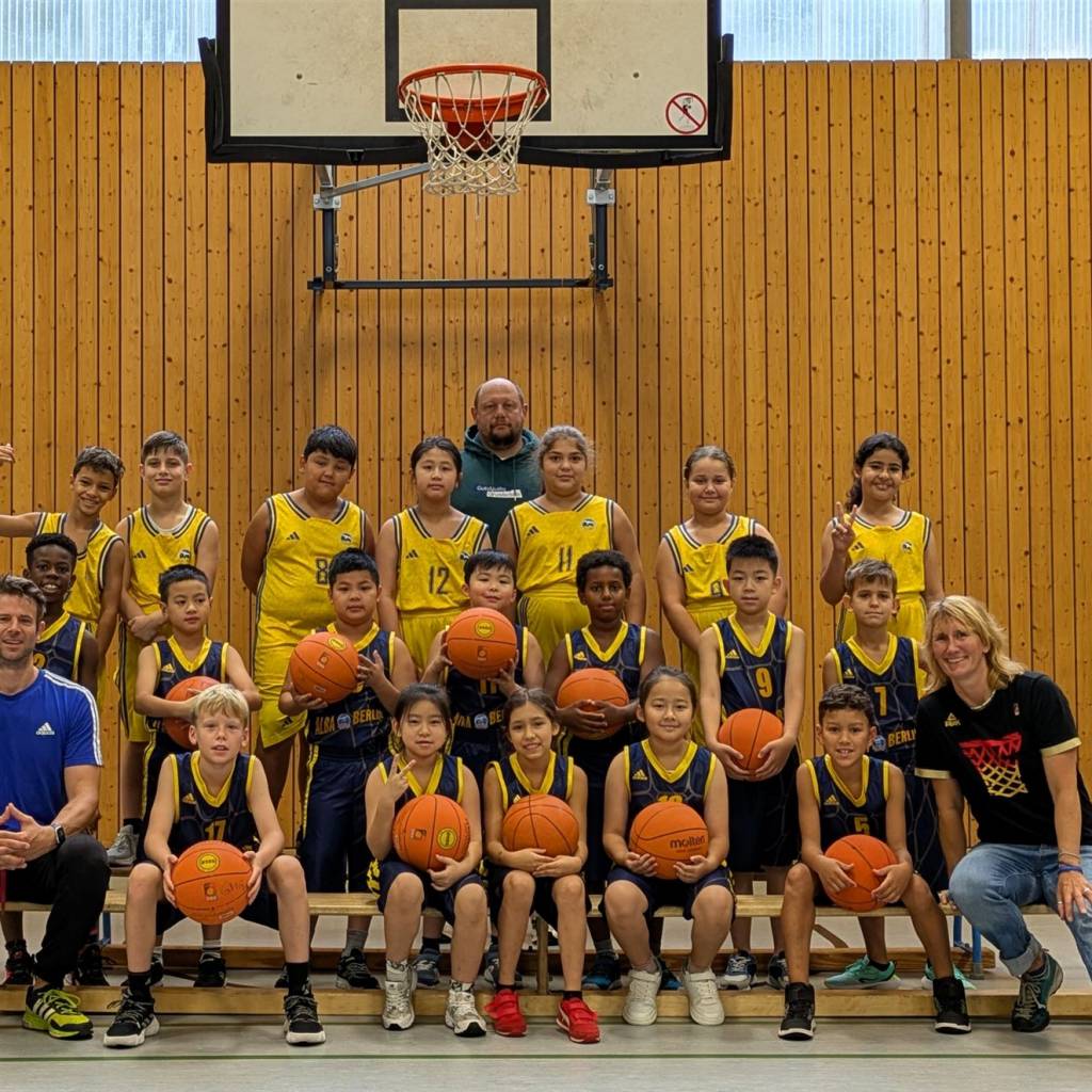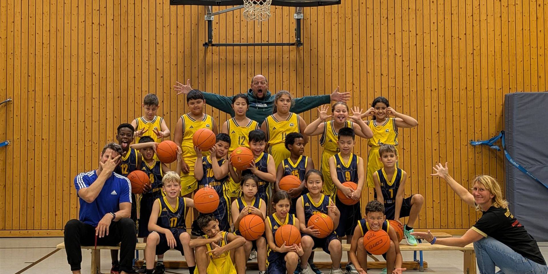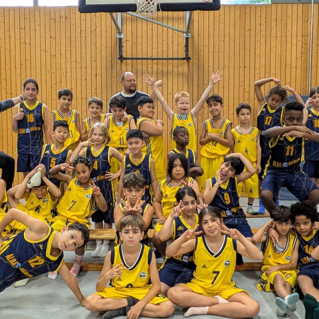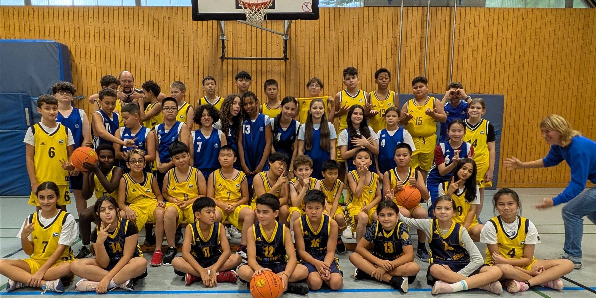 Über 100 Kinder spielen inzwischen bei uns Basketball. Das ist ein Viertel aller unserer Schülerinnen und Schüler. Die Freude ist nach wie vor riesig und die Motivation nach dem EM-Titel besonders hoch. Und so haben wir heute die Saison wie immer mit den Teamfotos begonnen uns mussten wirklich fast jedes unserer Trikots heraus holen. Und wie bei den Profis darf dabei natürlich auch das Spaßfoto nicht fehlen.