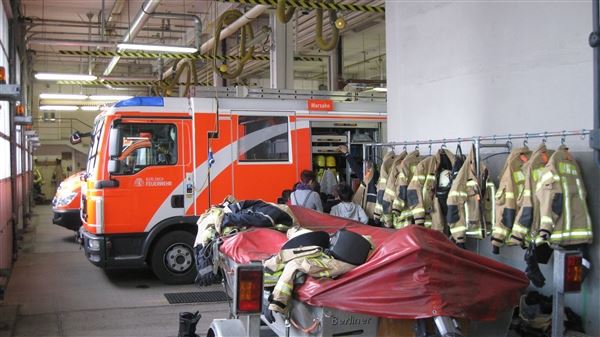 Am Tag danach gingen die Kinder der 3a auf die Feuerwache der zwei Männer, die am Vortag in unserer Schule zu Gast waren. Schon vom S- Bahnhof Poelchaustraße aus, konnten wir die rotlackierten Autos sehen.