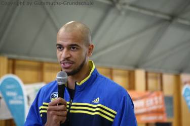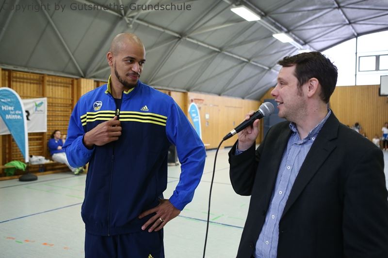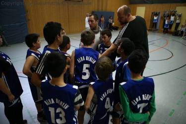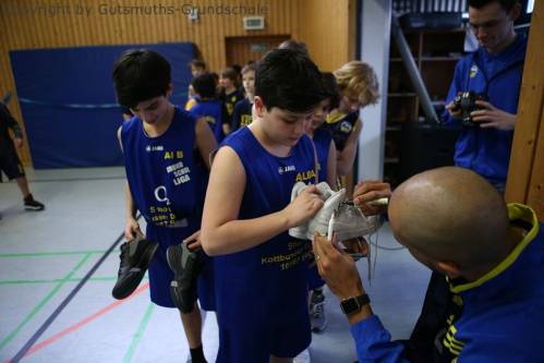 Ab 12.30 Uhr kamen dann die ersten Gastteams, die im Rahmen der Alba-Grundschulliga WK IV am Kiezturnier in unserer Halle teilnahmen. Die Vorfreude war bei allen war groß, denn auch Profi-Teamcaptain Alex King und der Vizepräsident von Alba Berlin Henning Harnisch hatten sich angekündigt. Alex King spielte ganz entspannt mit den Kids Bump Out zur Erwärmung, motivierte sie für ihre Zukunft, erfüllte jeden Autogrammwunsch und stand natürlich auch für das Gruppenfoto bereit. Henning Harnisch leitete als Schiedsrichter im Rahmen der Idee, ehemalige Profis pfeifen, das Turnier.