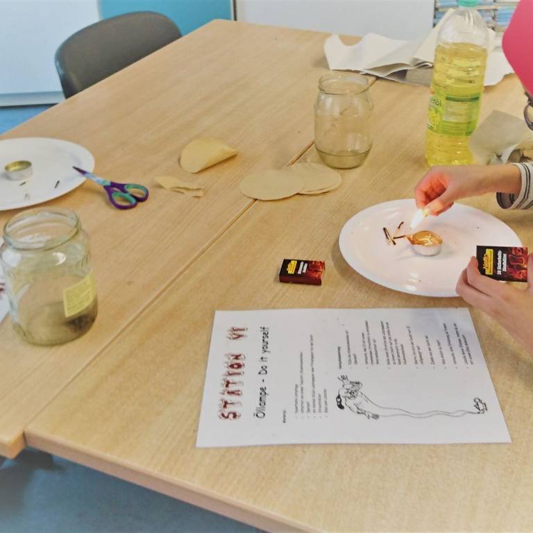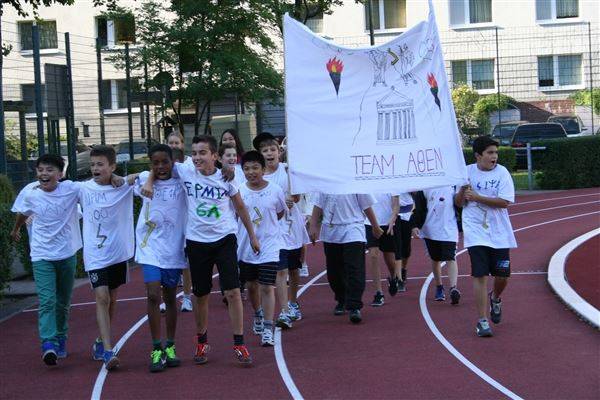 Zu Beginn des sechsten Schuljahres erleben die Schülerinnen und Schüler selbst, was eine antike Olympiade ausmacht und bedeutet. Im fächerverbundenen Projekt werden geschichtliche und sportliche Aspekte der Olympiade erarbeitet. Die Klassen sind Teams aus den Städten Athen oder Sparta, sie fertigen sich eigene Shirts und Flaggen an. In Traditionsdisziplinen wie Steinstoßen, Tauziehen oder Wagenrennen tragen sie die Wettbewerbe aus.