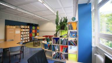 Mit den Mittel des Bonusprogramms haben wir 2014 einen Lernraum geschaffen, in dem die Lernumgebung das Lesen, Sprechen, Kommunizieren und Arbeiten mit Sprache unterstützt. Es ist inzwischen mehr, als nur ein Ort zum Lesen. Zum Schuljahr 20222/23 haben wir hier auch die sonderpädagogische Arbeit integriert.